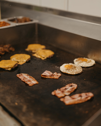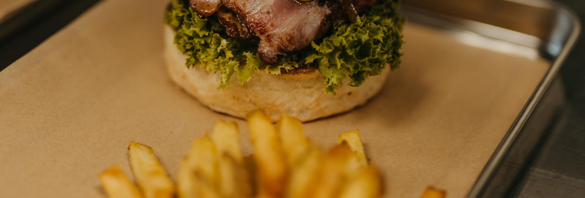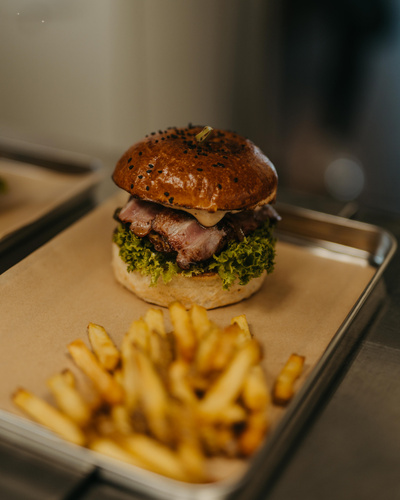 500g, 3x90g poctivé hovädzie, domáca žemľa, cheddar, slanina, nakladaná uhorka, naša mayo
